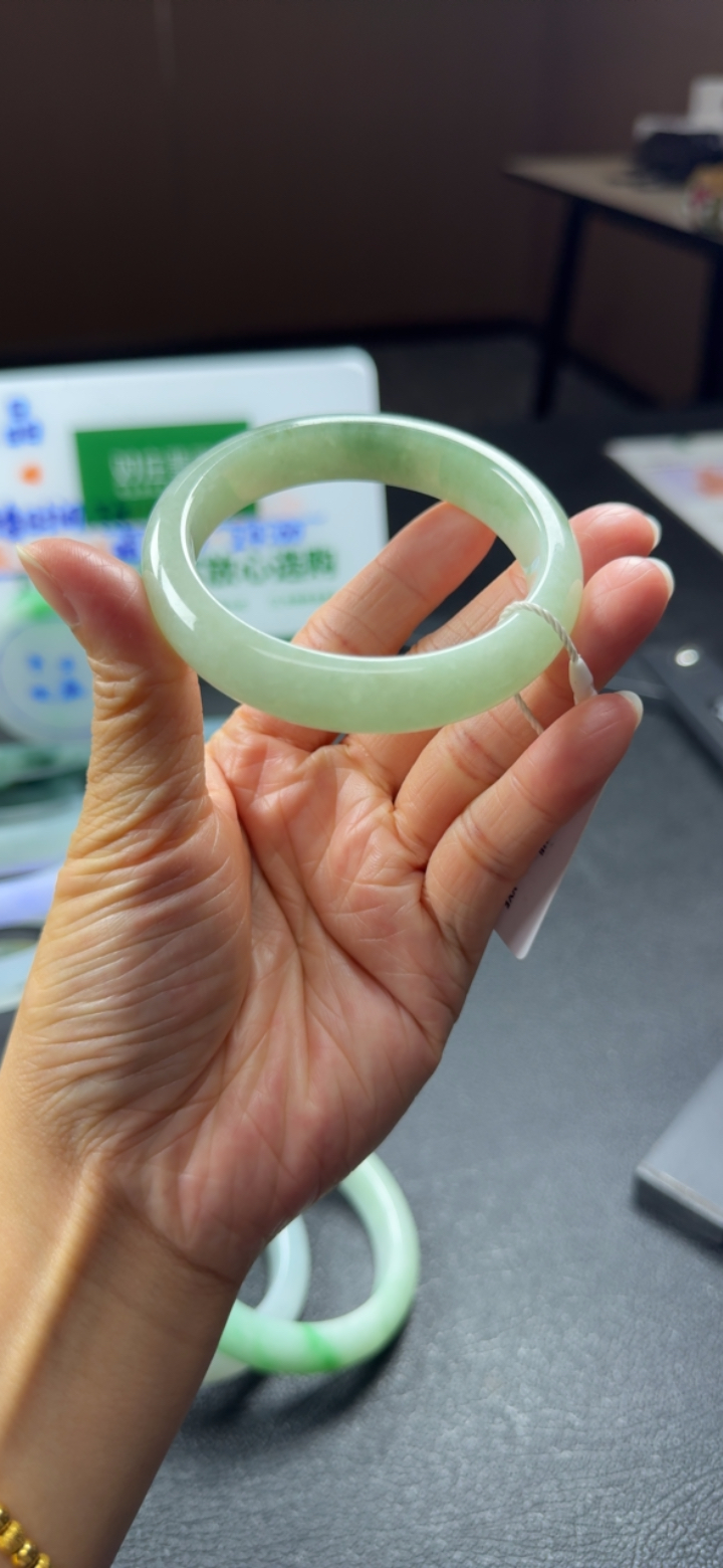 53.7mm自然光拍摄天然翡翠A货淡绿好种水正圈手镯47.74克